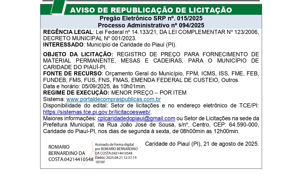 PREFEITURA MUNICIPAL DE CARIDADE DO PIAUI