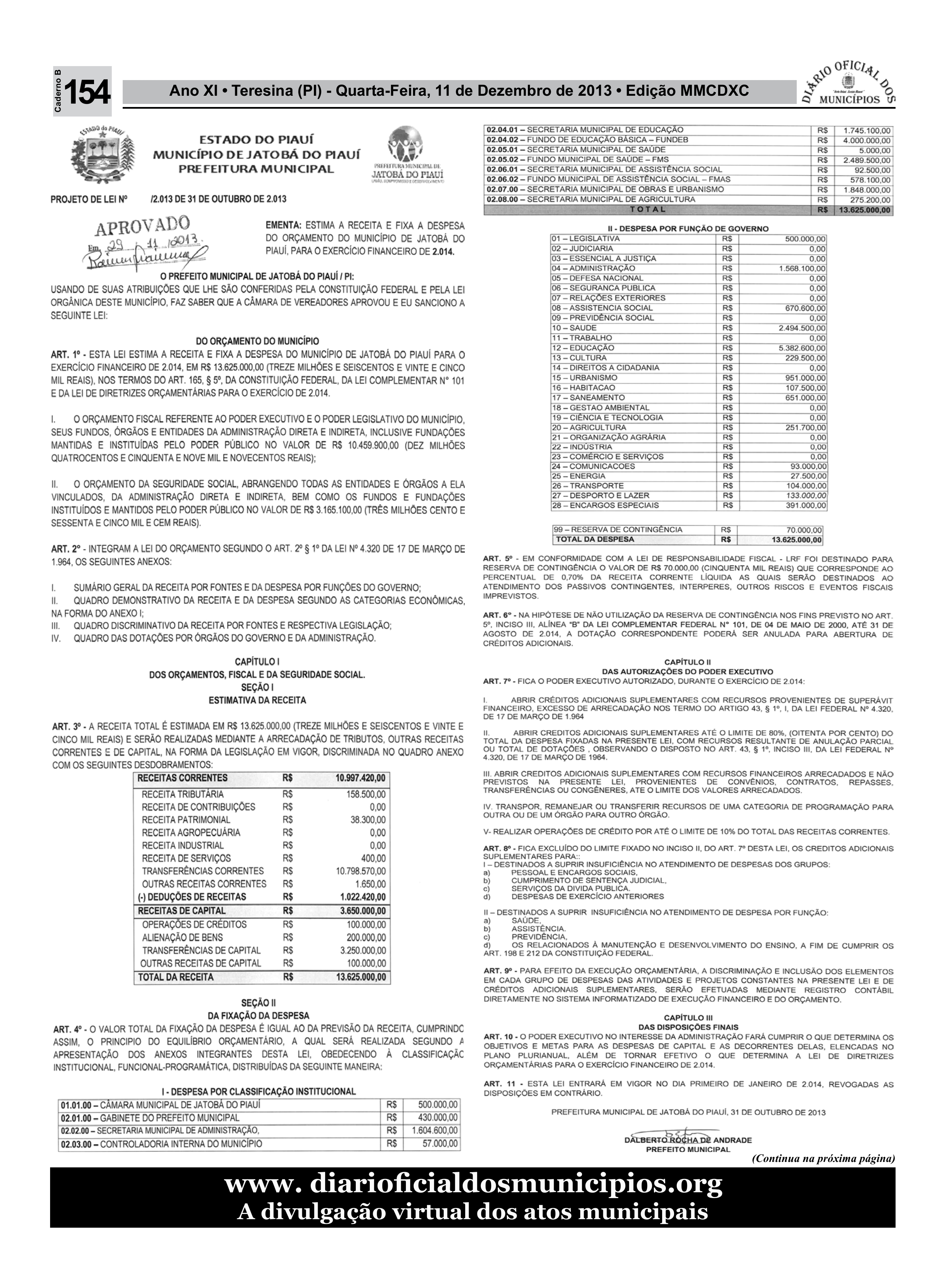 Lei publicada Projeto de LeiEstima receita e fixa despesas no orçamento 2014 |