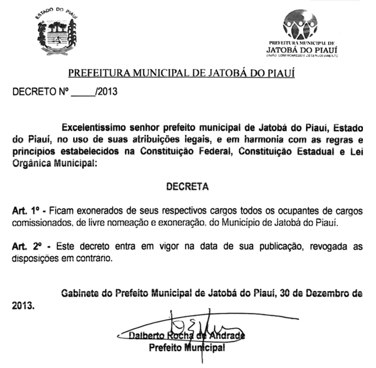 Lei publicada Decreto de exoneração de fincionáriosExonerando todos os funcionários contratados e de cargos de confianças 2013 |