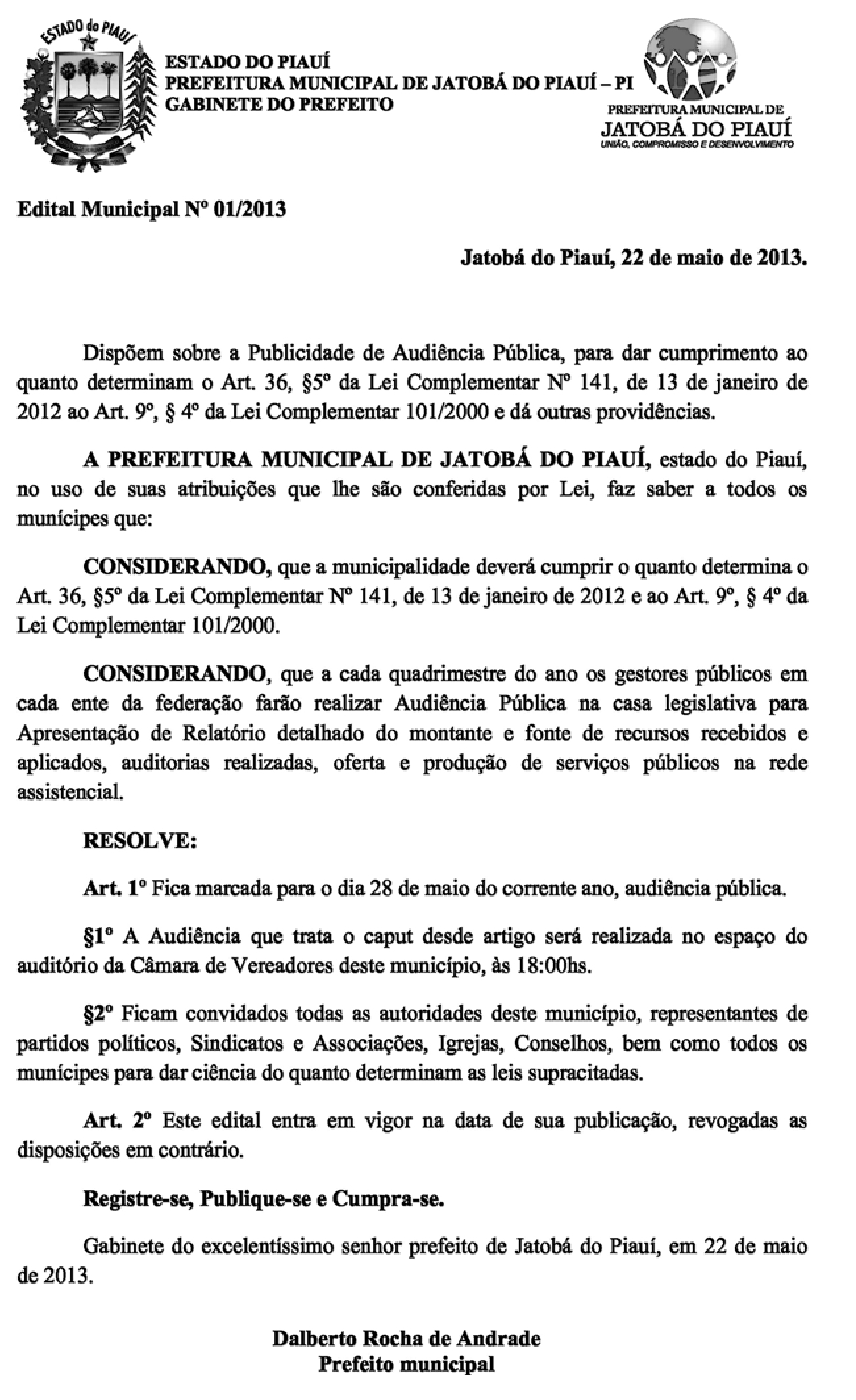 Lei publicada Edital 01/2013Dispõe sobre audiência Pública |