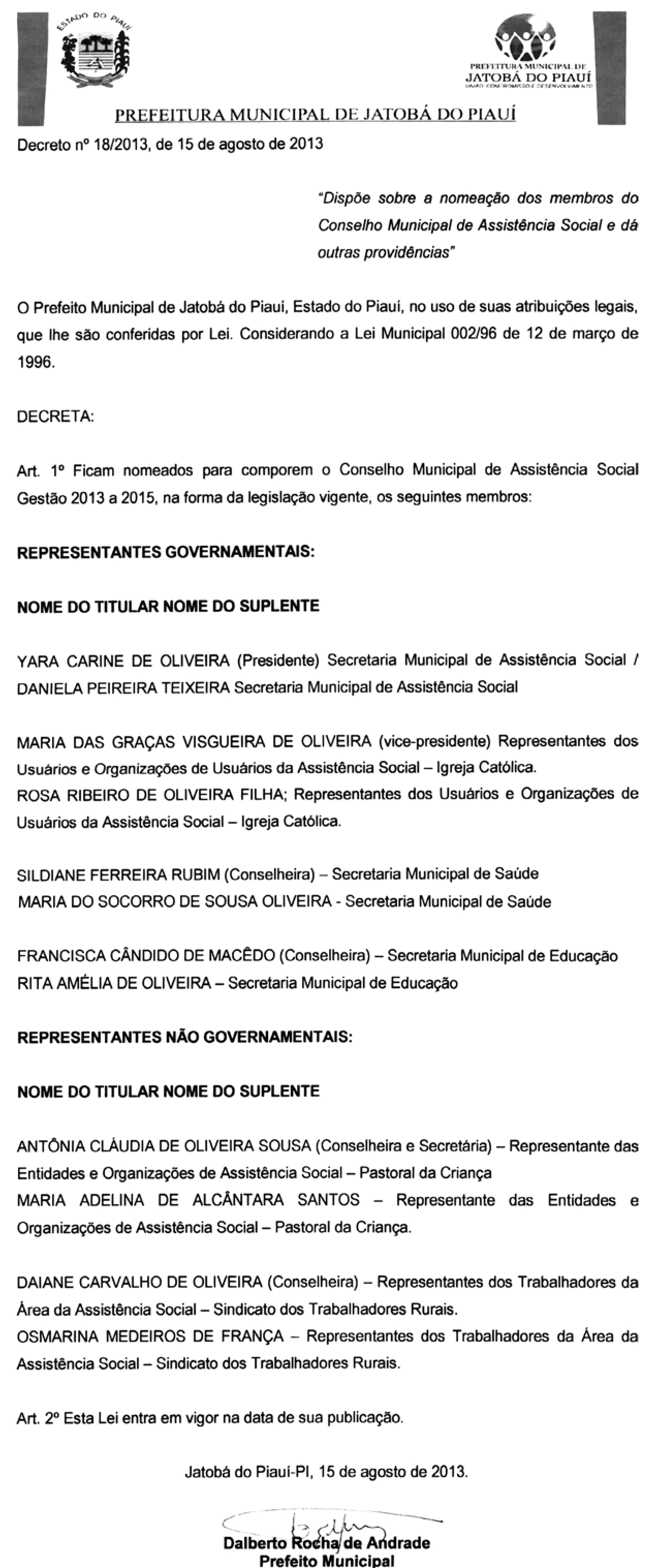 Lei publicada Decreto 18/2013Nomeação de membro para o Conselho de Assistência Social |