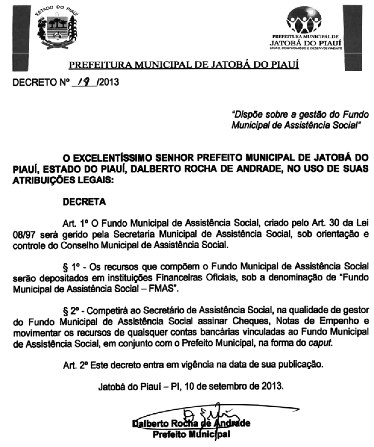 Lei publicada Decreto __/2013Dispõe sobre o fundo municipal de assitência Social |