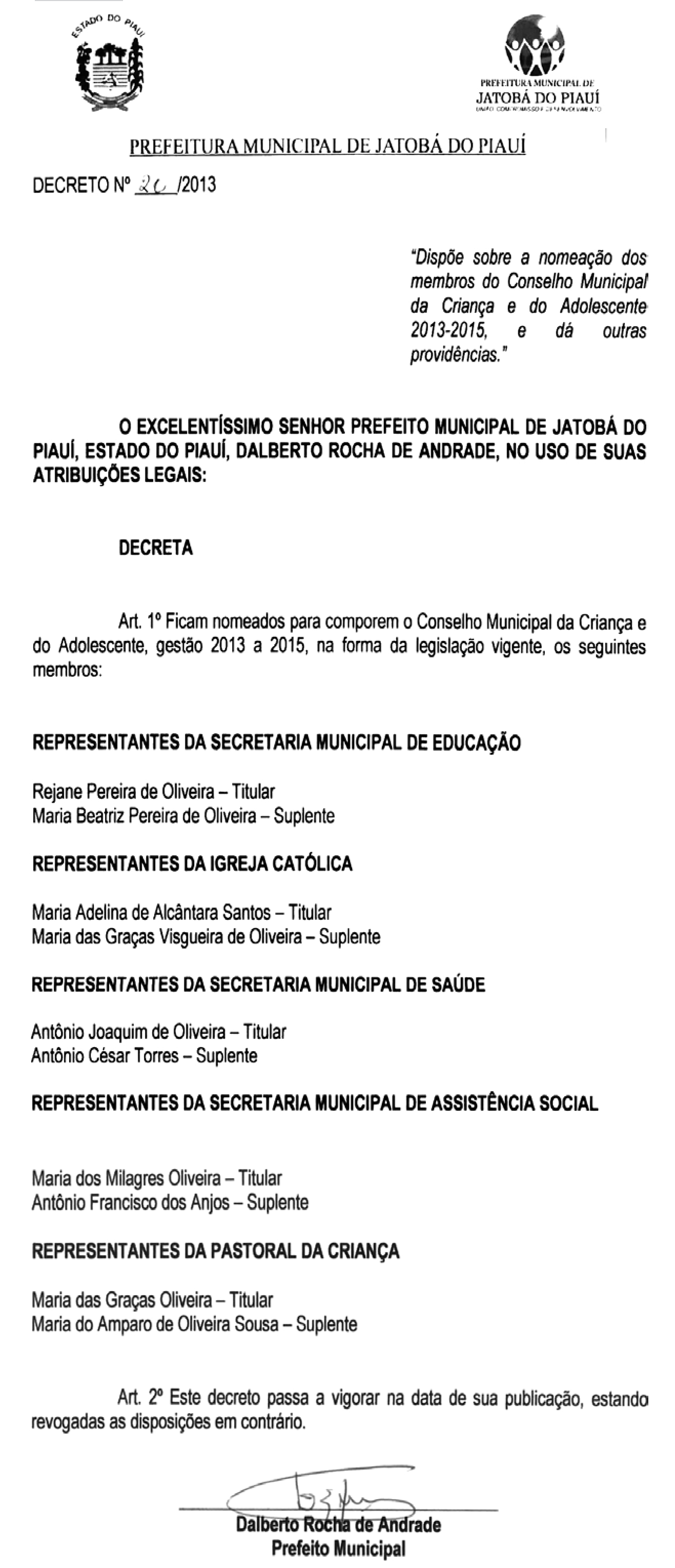 Lei publicada Decreto 20/2013Nomeação de membros do conselho da crianças e do adolescente 2013/2015 |