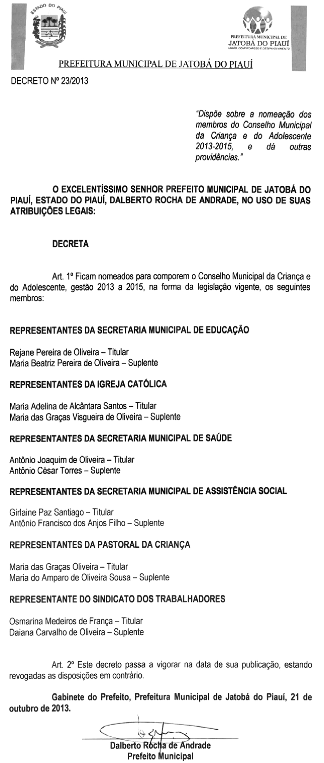 Lei publicada Decreto 23/2013Nomeação de membros do conselho da crianças e do adolescente 2013/2015 |