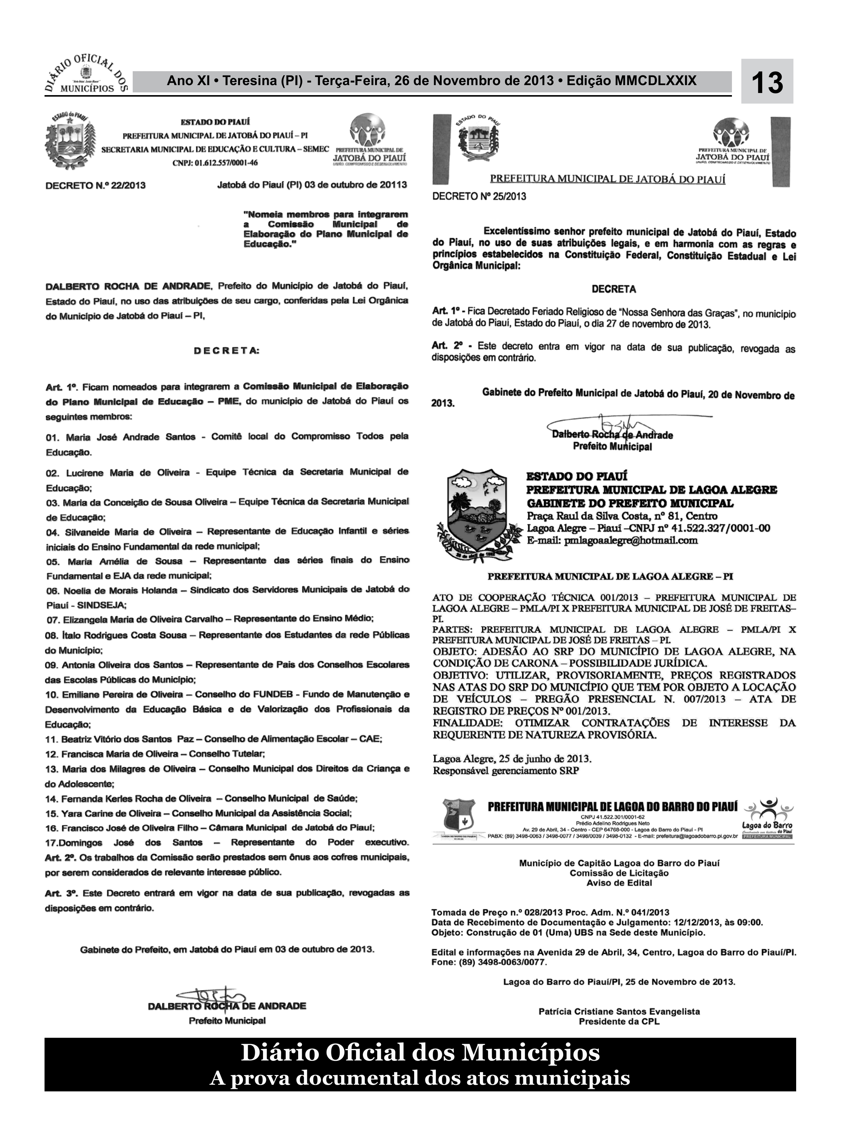 Lei publicada Decreto 22/2013 25/2013Nomeia membros da comissão Municipal de Elaboração do Plano Municipal de Educação; e Feriado Municipal |